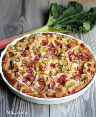 ja kardemumma. Sekoita kaikki pohjan ainekset keskenään tasaiseksi. Levitä taikina piirakkavuokaan. Kaada raparperipalojen joukkoon